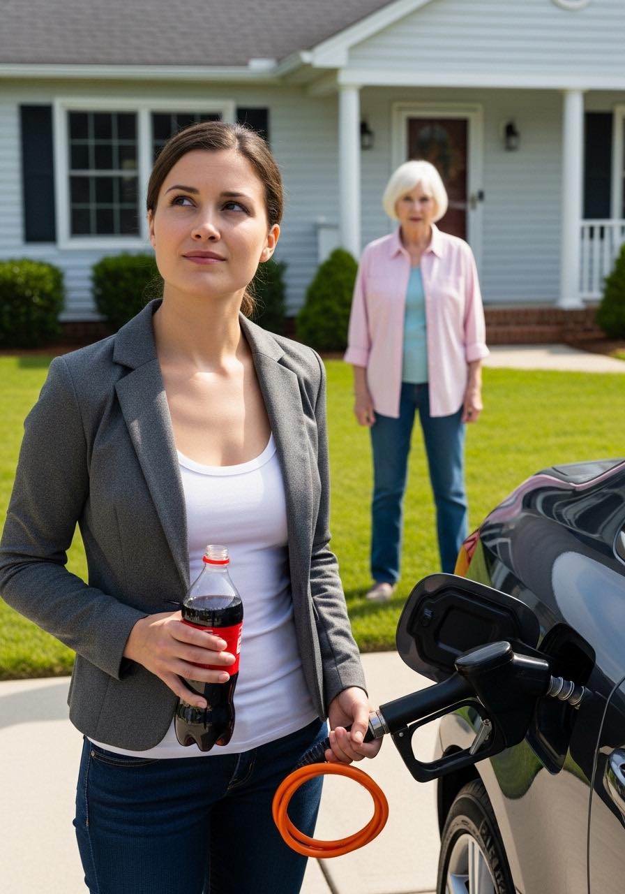 ‘O, sorry, ik heb per ongeluk frisdrank in de benzinetank van je SUV gegoten,’ grinnikte mijn zus nadat ik weigerde het appartement van mijn ouders over te dragen. Mijn moeder haalde haar schouders op. ‘Fouten gebeuren.’ Ik schreeuwde niet. Ik paste mijn verzekering aan, verwijderde hun toegang tot alle gedeelde rekeningen en ging naar bed. Om 7:42 uur ‘s ochtends klopten een sleepwagen en twee ambtenaren op haar deur – en tien minuten later lichtte mijn telefoon op met een telefoontje dat alles zou veranderen.