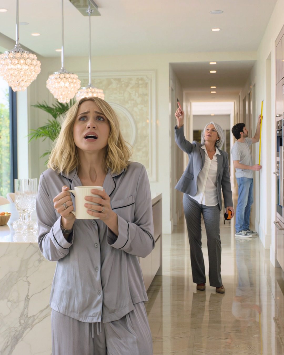 Terwijl Carla tegen het keukeneiland leunde en kalm uitlegde dat ze « haar investering terugverdiende », hoorde ik het metalen geklik en gezoem van het meetlint verderop in de gang. Spencer was in de logeerkamer de kast aan het opmeten alsof hij een interieurontwerper was die een verbouwing aan het plannen was.