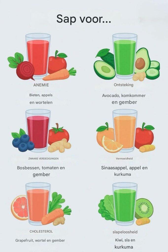 Natuurlijke sappen zijn een heerlijke en effectieve manier om het lichaam van belangrijke voedingsstoffen te voorzien, vooral in combinatie met bepaalde ingrediënten die geneeskrachtige eigenschappen hebben. Als u uw gezondheid op een natuurlijke manier wilt verbeteren, vindt u hier een selectie functionele sappen die bloedarmoede bestrijden, uw immuunsysteem versterken, het cholesterol verlagen, ontstekingen verminderen, vermoeidheid tegengaan en u zelfs helpen beter te slapen.