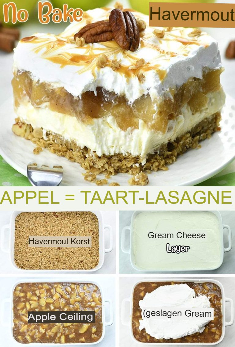 No-Bake Oatmeal Apple Pie Lasagna is een heerlijk, eenvoudig herfsttoetje zonder oven. De combinatie van een knapperige pecannoten-havermoutbodem, romige vanille-roomkaaslaag, huisgemaakte appelvulling en een luchtige slagroomtopping met karamelswirls maakt dit dessert onweerstaanbaar! 🍂