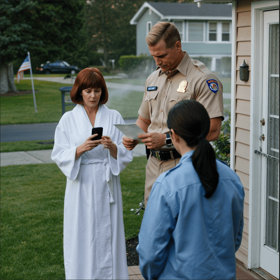 Ik greep naar mijn badjas, mijn handen trilden nog. Toen ik door het kijkgaatje keek, zag ik een man in een beige uniform. Op zijn vest glansde een insigne. Achter hem stond een patrouillewagen aan de kant van de weg.