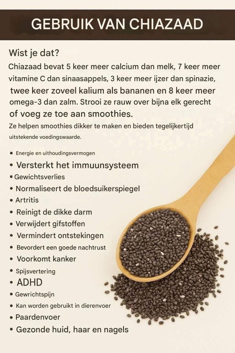 Chiazaad kan fungeren als een ingebouwd systeem om je eetlust te beheersen, dankzij het hoge vezelgehalte. Met bijna 10 gram vezels per 28 gram zet het uit in je maag en vormt het een gelachtige substantie waardoor je urenlang een vol gevoel hebt. Deze eigenschap van chiazaad helpt je om trek te verminderen en je gewicht te beheersen door minder te snacken. Het helpt ook de bloedsuikerspiegel te reguleren door de vertering van koolhydraten te vertragen. Dit betekent minder pieken en dalen, waardoor je je de hele dag stabiel en energiek voelt. Gebruikswijze: Week een eetlepel chiazaad 15-20 minuten in een glas water of melk en drink dit voor het ontbijt. Het is eenvoudig en perfect om je stofwisseling op gang te brengen. Je kunt hiervoor ook pepermuntolie gebruiken. 2. Verbeter je hartgezondheid: Chiazaad is een stille held als het om je hart gaat. Het is rijk aan omega-3-vetzuren, die helpen bij het verlagen van het slechte cholesterol en ontstekingen, twee belangrijke oorzaken van hart- en vaatziekten. Als je chiazaad regelmatig consumeert, kan het je helpen een gezonde bloeddruk te behouden en je algehele cholesterolprofiel te verbeteren. Bovendien helpen deze kleine zaadjes je hart soepel te functioneren, net als goede olie in een motor. Voeg gewoon chiazaadjes toe aan je ochtendsmoothie of strooi ze over je havermout. Ze mengen moeiteloos en geven je maaltijden een subtiele crunch. Tip: Je kunt chiazaadjes combineren met voedingsmiddelen die rijk zijn aan vitamine E, zoals amandelen of avocado’s. Deze combinatie versterkt de antioxidantbescherming voor je hart. 3. Ondersteunt een gezonde spijsvertering Als je spijsverteringssysteem wel wat extra aandacht kan gebruiken, zijn chiazaadjes de oplossing. Zoals gezegd, absorberen de oplosbare vezels water en veranderen ze in een gelachtige substantie die je ontlasting zachter maakt en de darmbewegingen bevordert! De vezels werken ook als prebioticum, wat de goede bacteriën in je darmen voedt. Een gezond darmmicrobioom betekent een betere opname van voedingsstoffen, minder een opgeblazen gevoel en een algehele harmonie in de spijsvertering.