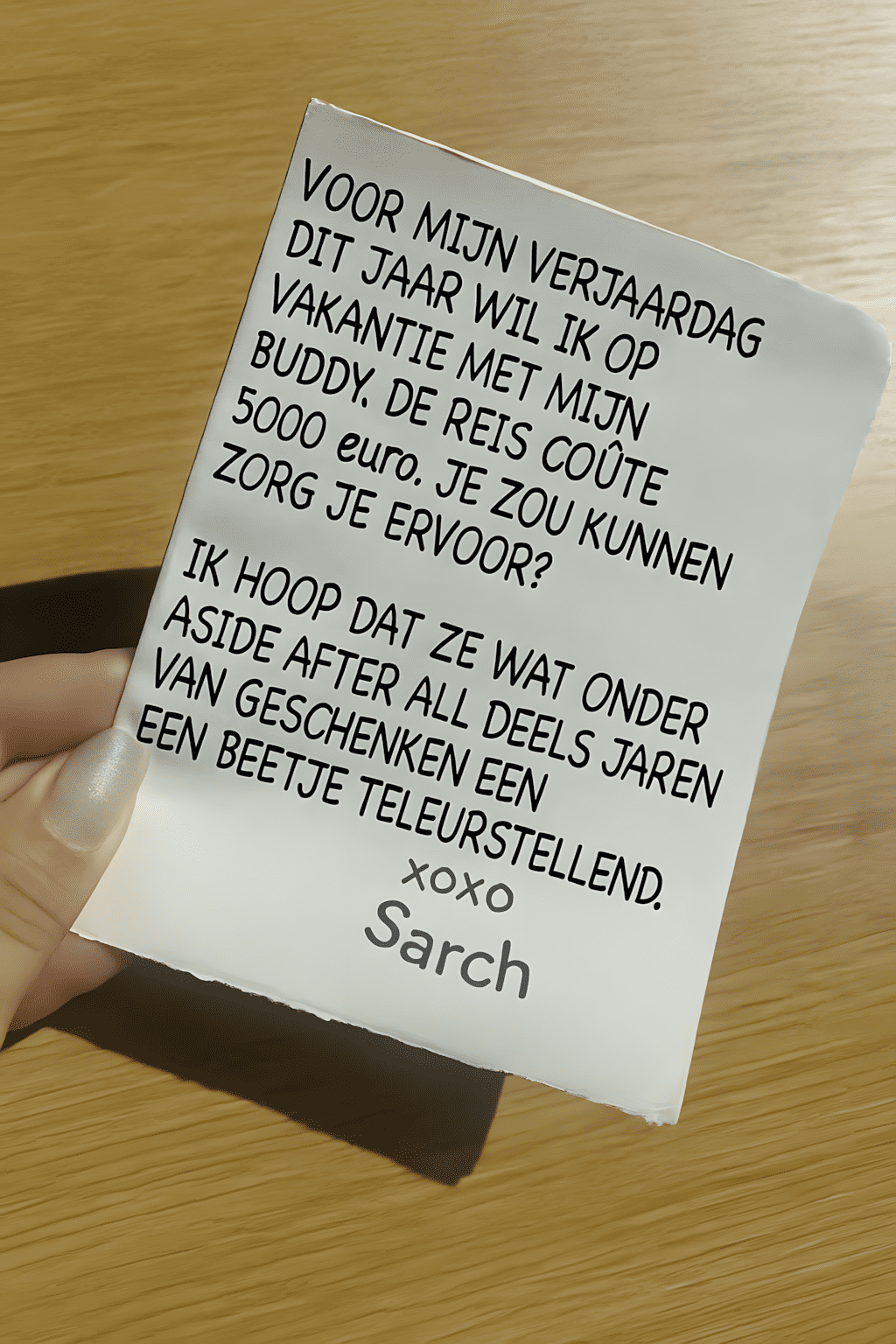 In de brief, vergezeld van een offerte voor 5.000 euro , werd hen gevraagd een vakantie voor haar bruiloft te financieren, met de bijtende opmerking: “Ik hoop dat je na al die jaren van goedkope cadeaus genoeg hebt gespaard.”