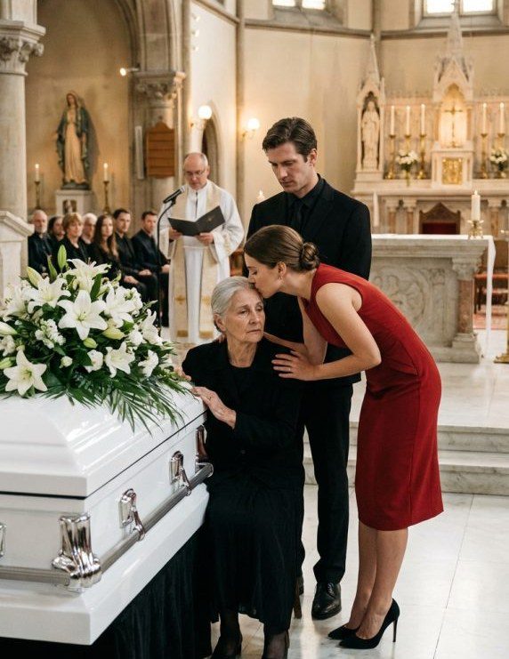 Geen geforceerde glimlach. Geen glimlach die door verdriet werd veroorzaakt. Een nonchalante, tevreden glimlach – alsof hij te laat was aangekomen op een feest waar hij van verwachtte te genieten. Zijn pak was onberispelijk. Zijn haar zat perfect. En aan zijn arm liep een jonge vrouw in een rode jurk , met opgeheven kin en ogen die straalden van een zelfvertrouwen dat niet thuishoorde in een kerk.