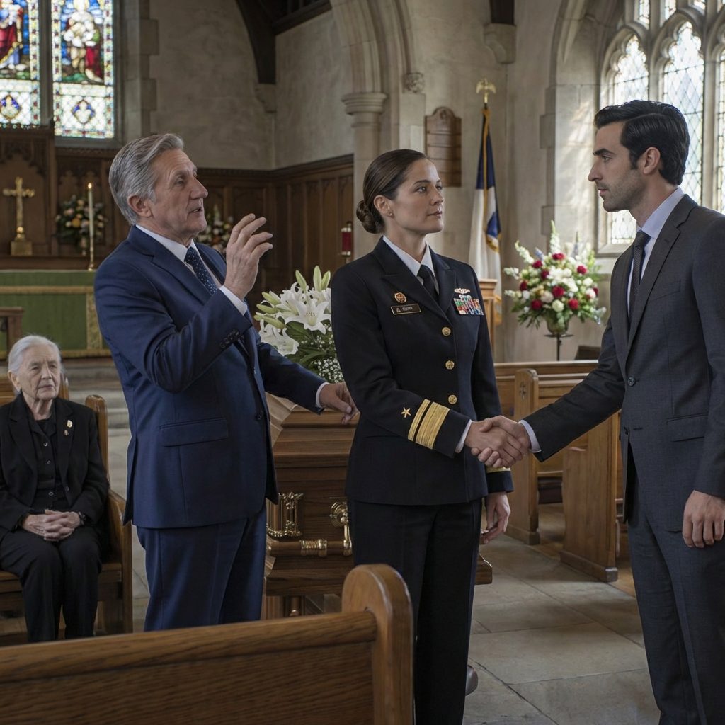 Vandaag, op de begrafenis van mijn moeder, stond ik daar in mijn volledige marine-uniform, terwijl hij naar me toe kwam met diezelfde zelfvoldane grijns – alsof ik nog steeds zestien was, nog steeds bang, nog steeds de dochter die hij dacht te kunnen laten verdwijnen door haar te beschamen. Hij boog zich voorover en fluisterde: « Dus je hebt je lesje eindelijk geleerd. » En op dat moment – na twintig jaar stilte, na een leven te hebben opgebouwd waarvan hij nooit had gedacht dat ik het zou kunnen – keek ik hem recht in de ogen en zei: « Rustig als een kalme zee. » Ja. En toen ontmoette ik mijn man.