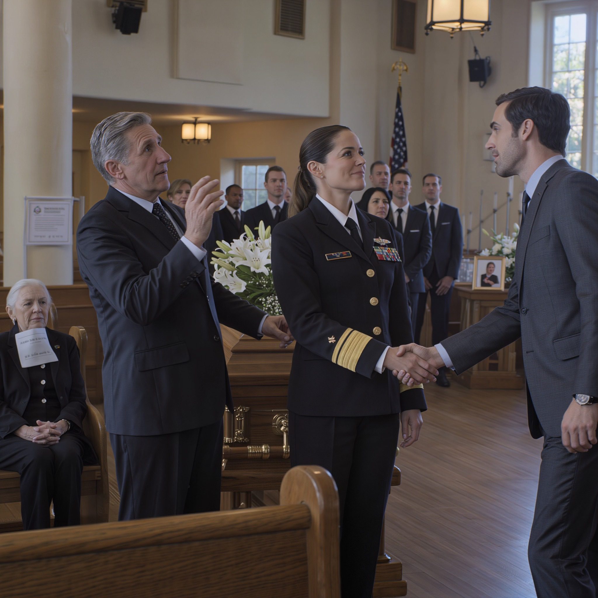 Vandaag, op de begrafenis van mijn moeder, stond ik daar in mijn volledige marine-uniform, terwijl hij naar me toe kwam met diezelfde zelfvoldane grijns – alsof ik nog steeds zestien was, nog steeds bang, nog steeds de dochter die hij dacht te kunnen laten verdwijnen door haar te beschamen. Hij boog zich voorover en fluisterde: « Dus je hebt je lesje eindelijk geleerd. » En op dat moment – na twintig jaar stilte, na een leven te hebben opgebouwd waarvan hij nooit had gedacht dat ik het zou kunnen – keek ik hem recht in de ogen en zei: « Rustig als een kalme zee. » Ja. En toen ontmoette ik mijn man.