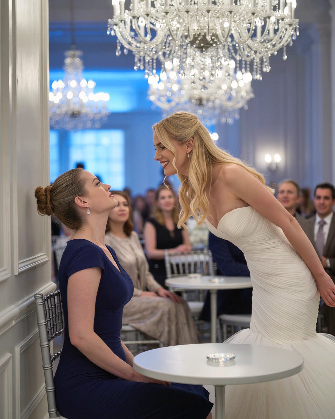Tegen de tijd dat mijn zus naar me toe boog met haar perfecte lippen in die kleine, vlijmscherpe glimlach, voelde de balzaal minder aan als een feest en meer als een podium waar ik zonder script op was gesleept.