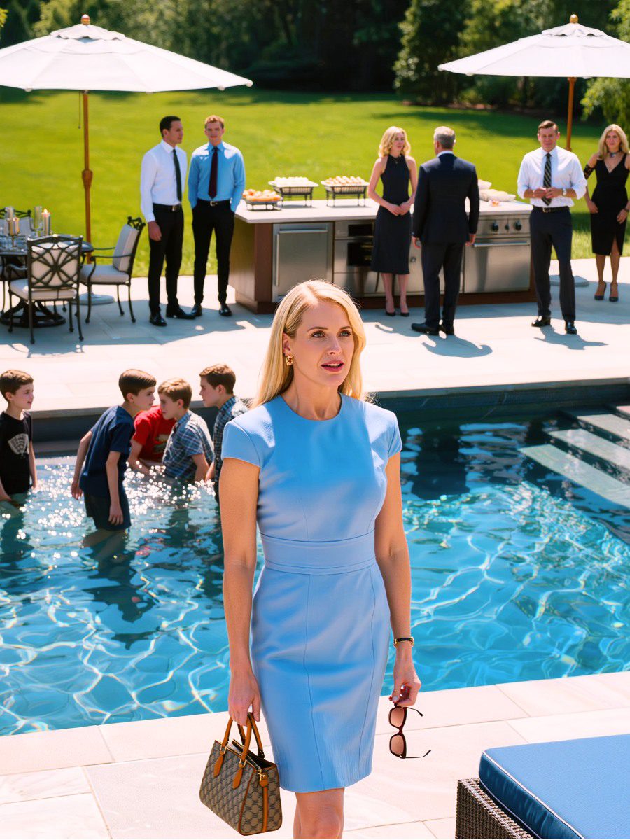 Het zwembad zag eruit alsof het uit een hotel kwam – lang en glinsterend, met een ondieper gedeelte waar een paar tieners half onder water lagen te scrollen op hun telefoons. Daarachter stond de buitenkeuken: glimmende roestvrijstalen apparaten, een enorm stenen kookeiland, rijen flessen die glinsterden van de condens in ijsemmers. Parasols boden schaduw aan groepjes witte ligstoelen. Overal waar ik keek, zag ik mensen: vrouwen in zorgvuldig uitgekozen badpakken en strandjurkjes, mannen in dure poloshirts, kinderen die rondrenden in felgekleurde zwemshirts.