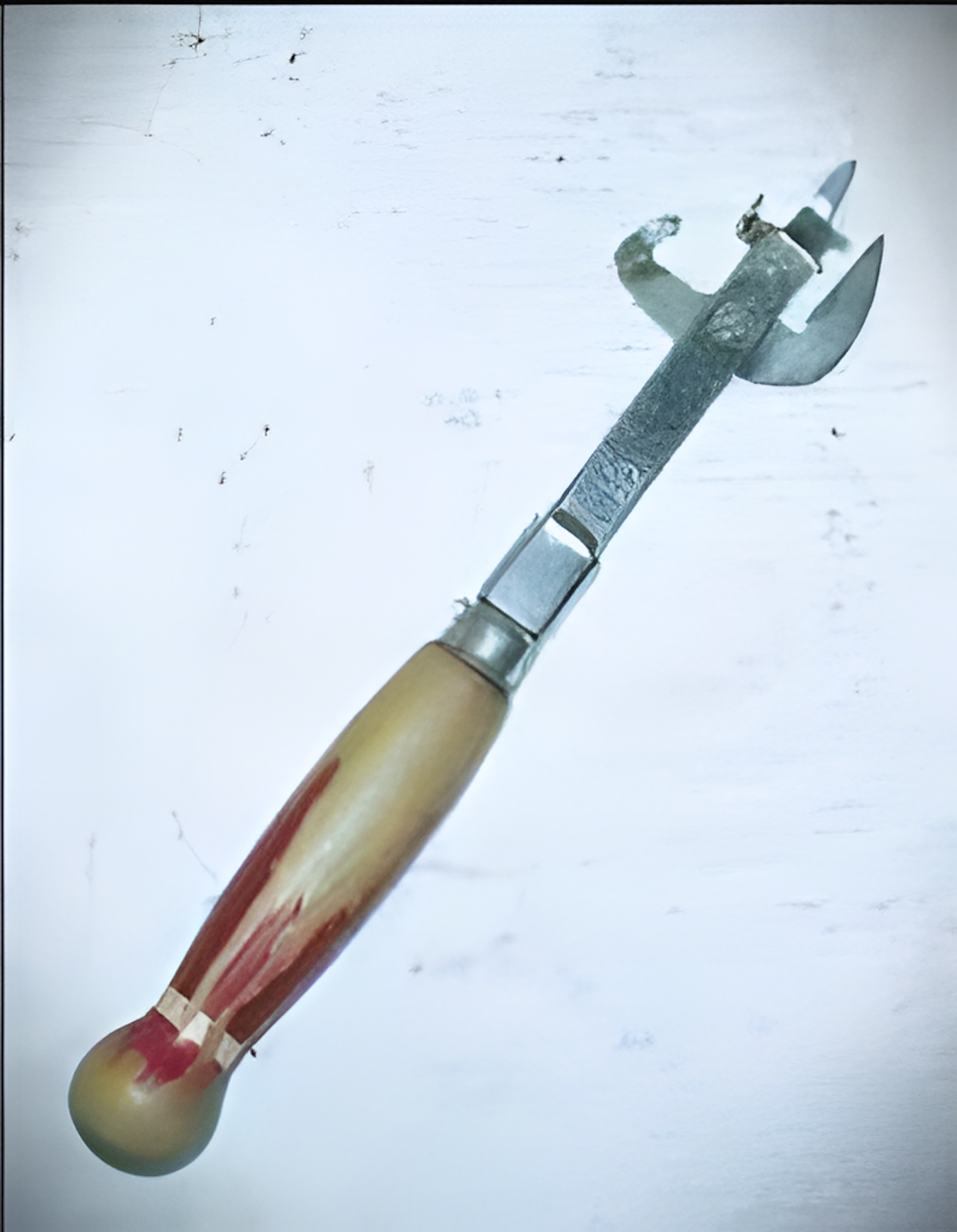 Het primitieve keukengereedschap is een ouderwetse blikopener die veel littekens heeft achtergelaten bij onervaren gebruikers die probeerden de inhoud uit blikken te halen.