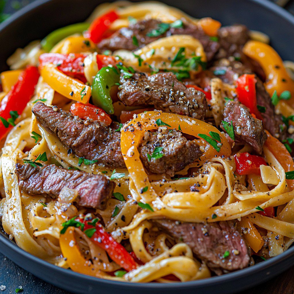 Sissende steak en paprika pasta