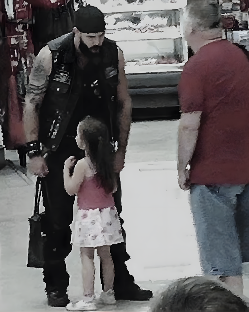 Het zesjarige meisje dat niet kon praten, rende bij Walmart recht in de armen van de gigantische motorrijder en zette in paniek haar handtekening, terwijl de tranen over haar gezicht stroomden.