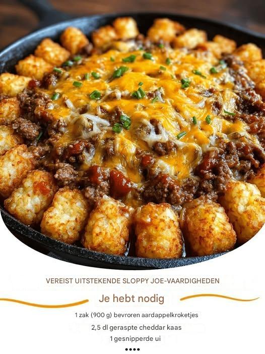 Aardappelkroketjes, pittig rundvlees, uien, zoute saus en cheddar kaas worden samen in een koekenpan bereid – een troostrijk, smaakvol en gezinsvriendelijk gerecht.