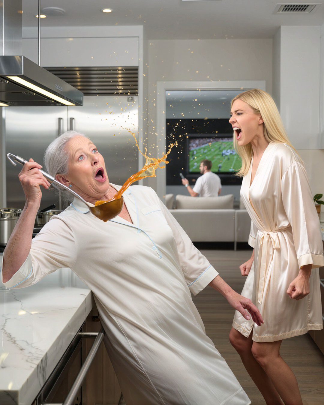 ‘Kijk eens,’ sneerde Crystal naast me, terwijl ze de pan naar voren trok om erin te kijken. ‘Probeer je ons te verdrinken in zout? Dit lijkt wel varkensvoer. Hoeveel heb je erin gegooid, hè? Probeer je ons nu te vergiftigen?’