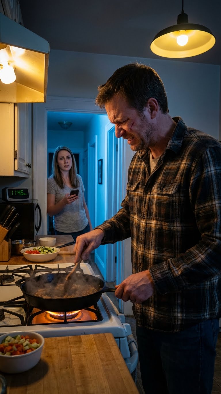 Even staarde ik naar het scherm alsof ik dacht dat woorden verkeerd gelezen konden worden als ik maar hard genoeg knipperde. De geur van knoflook en boter vulde onze keuken. De pan siste zachtjes. Mijn man, Ryan, stond in een T-shirt en schort bij het fornuis en neuriede zachtjes alsof er niets aan de hand was.