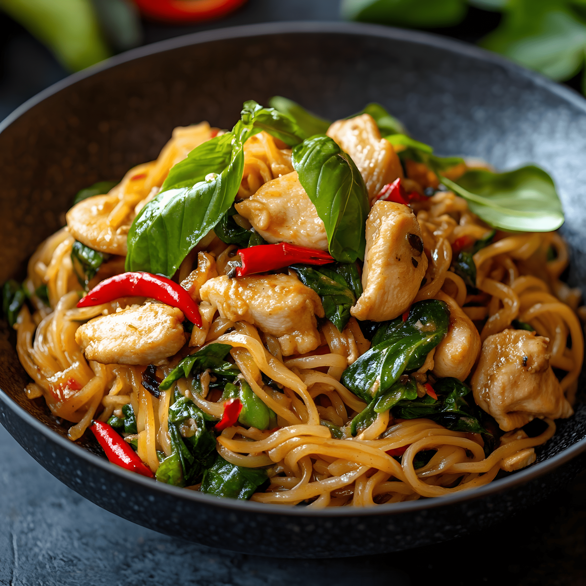 Een flinke hand Thaise basilicumblaadjes (of gewone basilicum als alternatief)