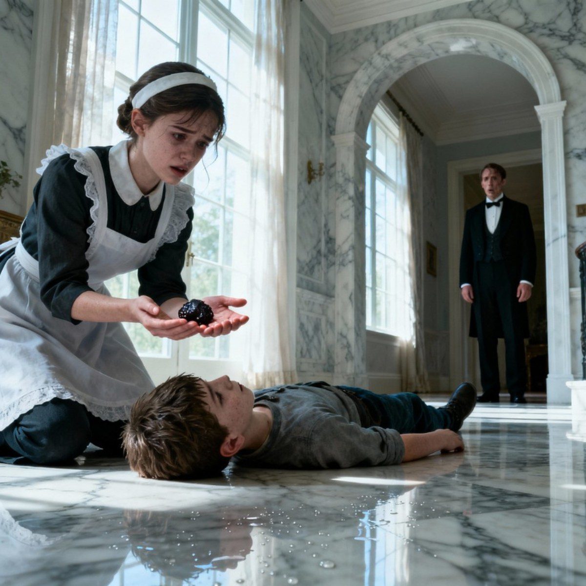 Het marmer in de foyer van het Thompson-huis ademde de stilte van een museum, koel en smetteloos onder de kroonluchters die het licht als voorzichtig applaus verspreidden. Portretten in vergulde lijsten keken zonder oordeel toe; gepolijste trapleuningen glansden; de bedienden van die dag bewogen zich met de stille choreografie van mensen die getraind waren om geen echo achter te laten. In dit huis was stilte onderdeel van het decor.