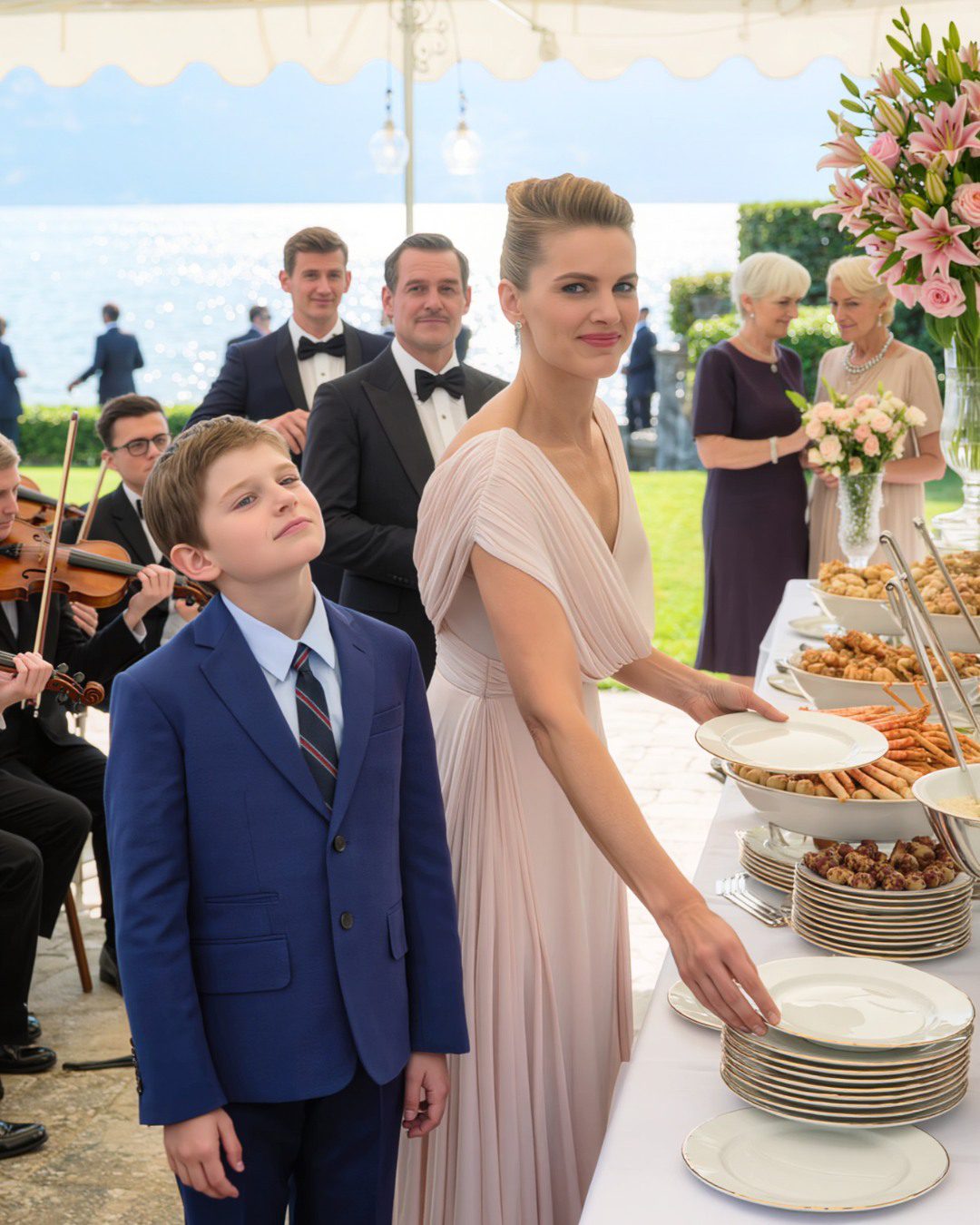 Hij ging als een bewaker voor de gekoelde garnalen staan, met zijn voeten wijd uit elkaar en zijn kin omhoog. Zijn ogen gleden over me heen – mijn jurk, mijn schoenen, mijn blote handen boven de borden – alsof hij alle manieren waarop ik er niet thuishoorde in kaart bracht.