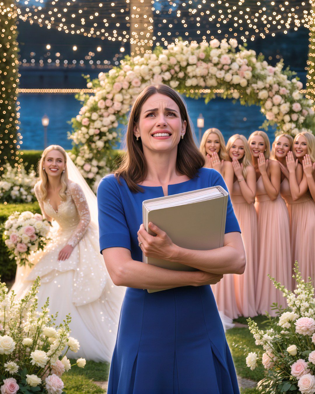 Ik stond daar, midden in de met feeënlampjes versierde tuin waar ik voor betaald had, mijn map stevig vastgeklemd, en even werd het vreemd stil. Het geroezemoes van de gesprekken verstomde. Het geklingel van glazen, het geritsel van bladeren, het gemompel van de weddingplanner – alles vervaagde tot één geheel.