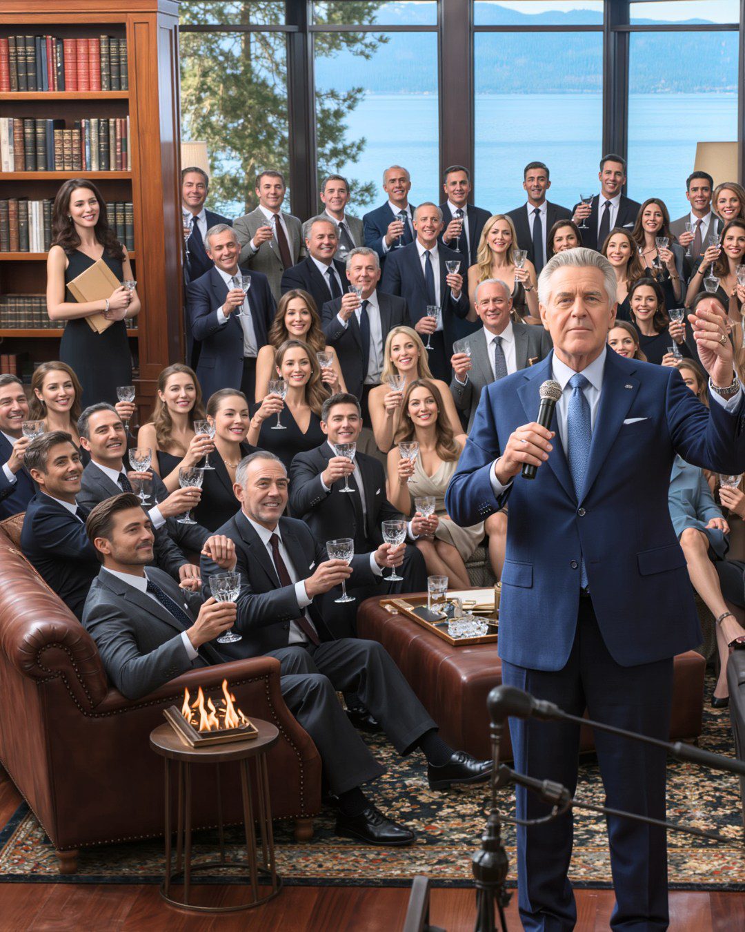 Even daarvoor had de kamer nog gezoemd – gelach, het geklingel van bestek, het zachte gemurmel van geld dat tegen geld praatte. Toen tikte mijn vader met zijn lepel tegen zijn glas, en de hele woonkamer van het landgoed aan Lake Tahoe werd stil. Vijftig keurig geklede mensen draaiden zich naar hem toe alsof ze door touwtjes werden getrokken.