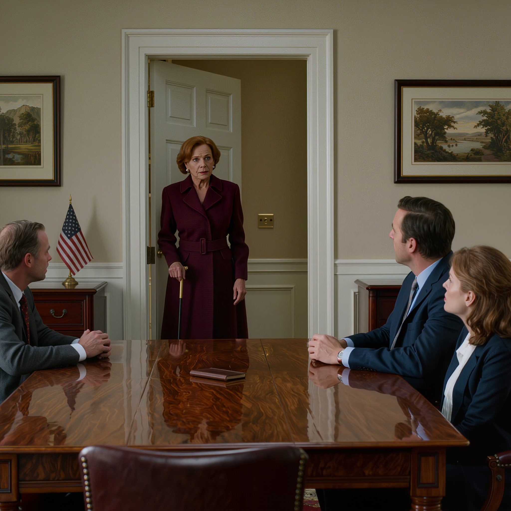 ‘Ik zie dat ik niet verwacht werd,’ zei ik langzaam, terwijl ik met mijn wandelstok op de houten vloer tikte en dichterbij stapte. ‘Goedemiddag.’