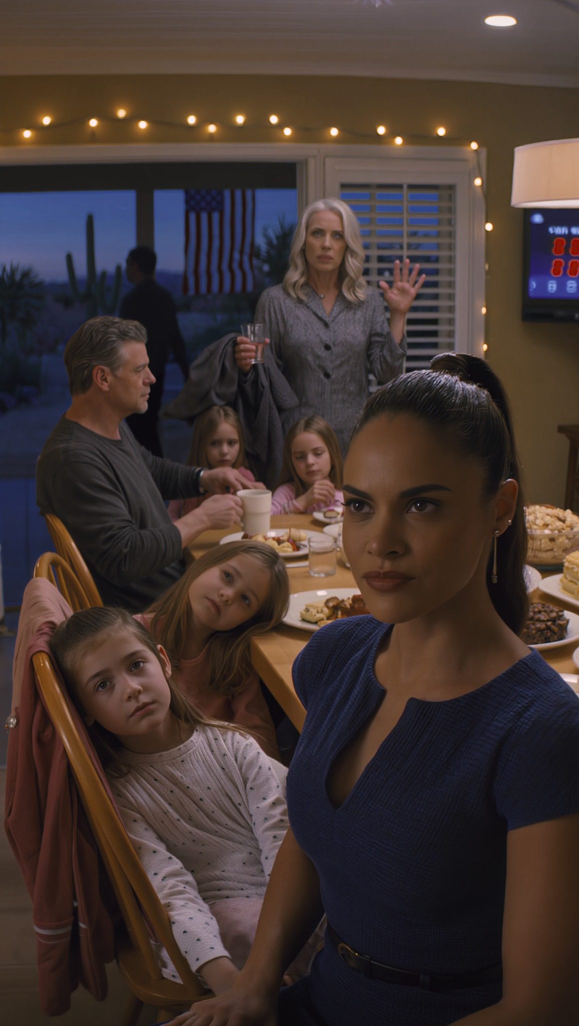 We waren halverwege het dessert in haar gloednieuwe, glimmende huis in de buitenwijk, iedereen deed alsof ze ontspannen was terwijl de tv op de achtergrond aftelde naar middernacht, toen ze plotseling opstond, haar glas ophief en luid genoeg voor de hele eetkamer om te horen zei: « We passen niet meer op jullie kinderen. »