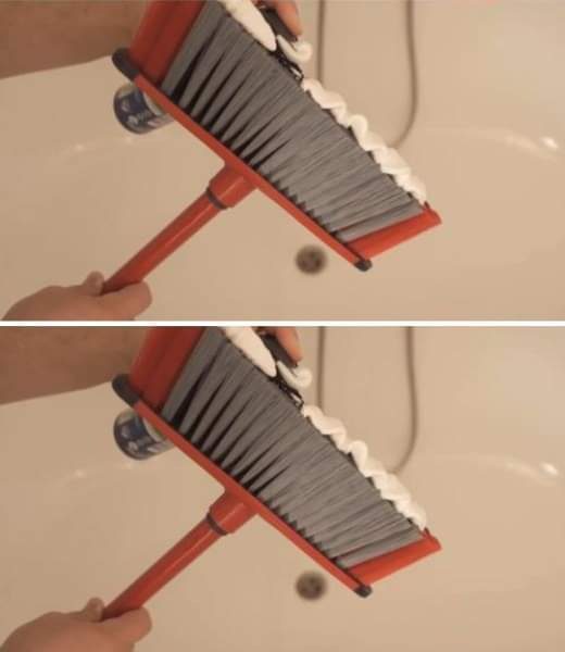 1. Spuit een royale hoeveelheid scheerschuim direct op de borstelkop van de bezem.