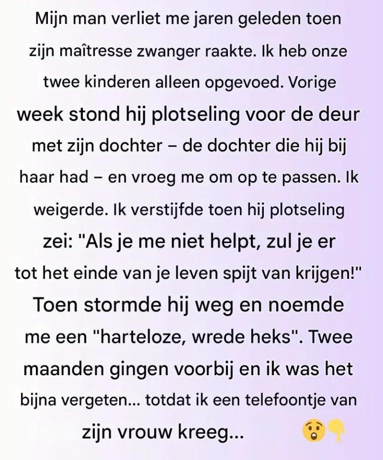 Jaren geleden verliet mijn man me toen zijn minnares zwanger raakte. Ik heb onze twee kinderen alleen opgevoed. Toen, vorige week, stond hij onverwachts voor de deur met zijn dochter – de dochter die hij bij haar had – en vroeg me om op te passen.