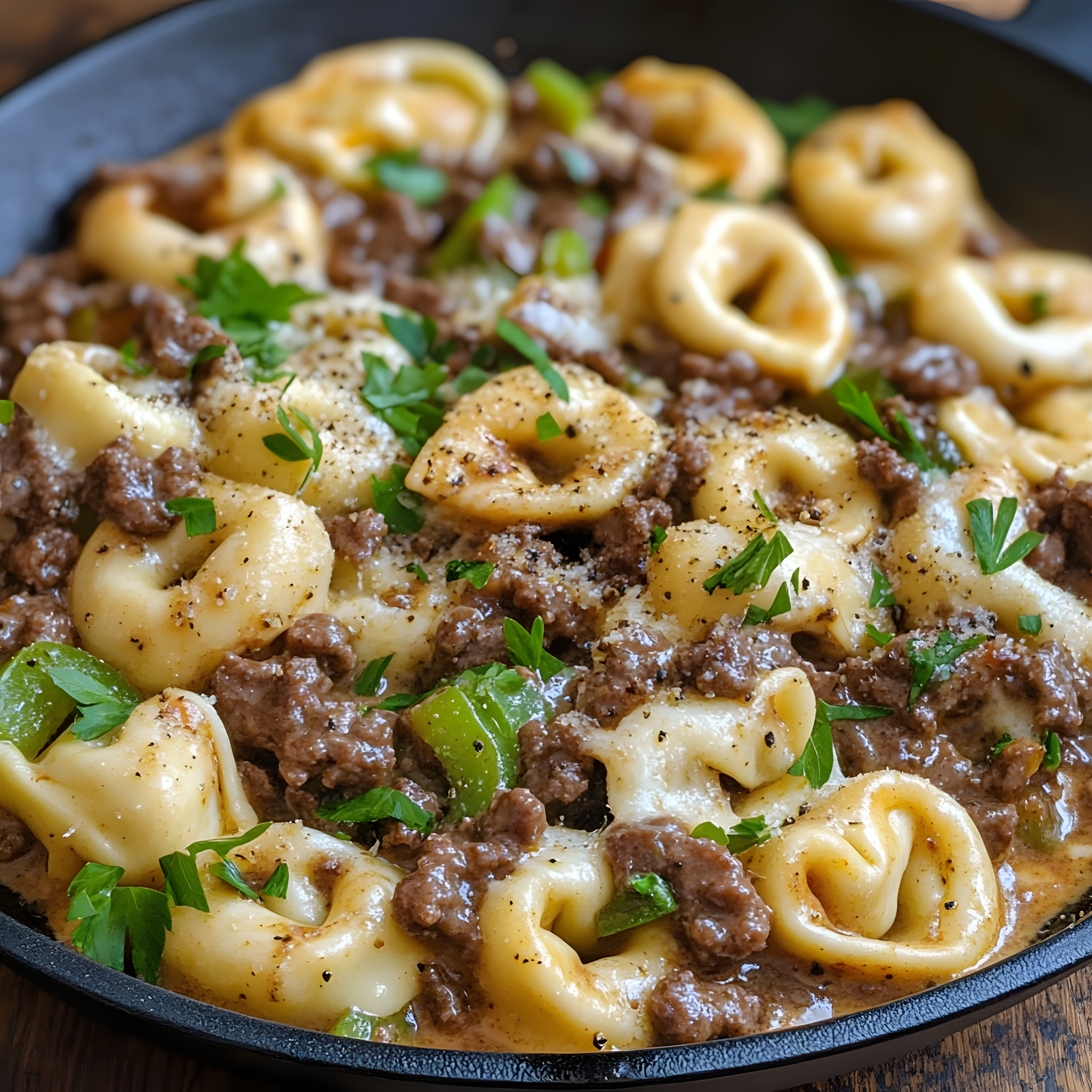 « Deze pan vol tortellini met cheesesteak en romige provolonesaus is zó lekker dat je nooit meer iets anders wilt! 🍝🧄🔥 »