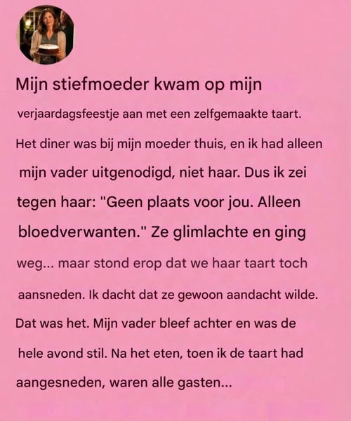 Het feest werd gehouden in het huis van mijn moeder, en ik had alleen mijn vader uitgenodigd. De onuitgesproken geschiedenis tussen de volwassenen in mijn leven was al ingewikkeld genoeg zonder extra spanning, en ik had de avond zorgvuldig gepland om gênante situaties te voorkomen. Toen de deurbel ging en ze met de taart in haar handen en een onzekere blik op haar gezicht voor de deur verscheen, dacht ik geen moment na. Ik reageerde instinctief.