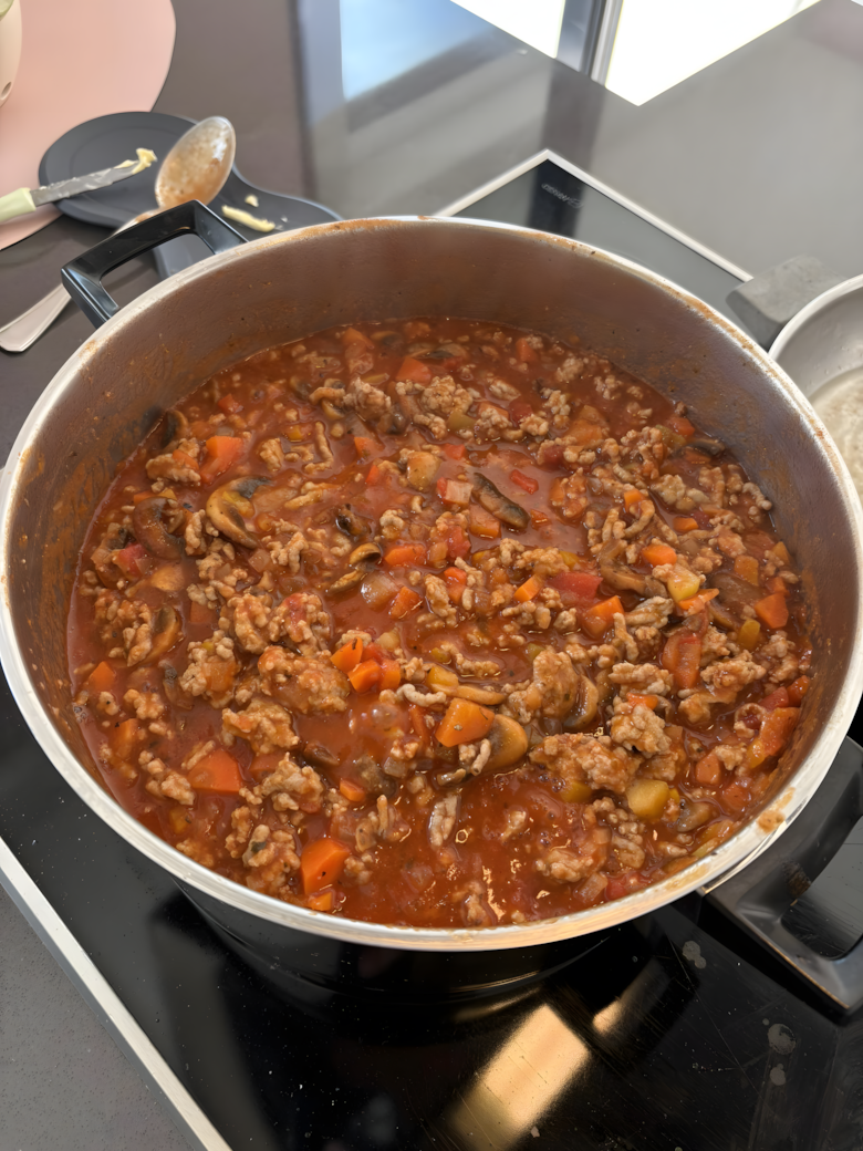 Vandaag geen standaard bolognaise, maar een verse, huisgemaakte spaghettisaus met massa’s groenten — gezond, kleurrijk en heerlijk kruidig! 😋