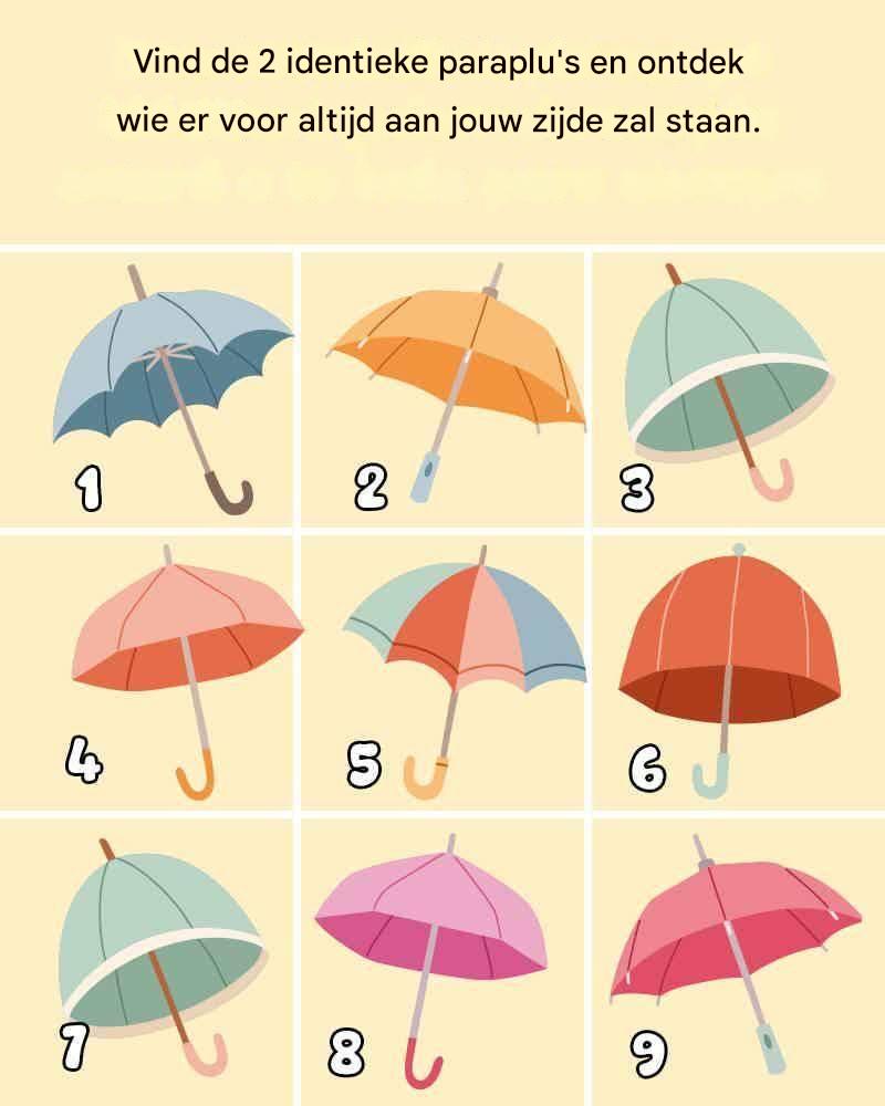 Ze zeggen dat het vinden van je soulmate is als het vinden van het juiste puzzelstukje. In deze quiz dagen we je uit om twee identieke paraplu’s te vinden. Op basis van jouw keuze onthullen we wie er voor altijd aan jouw zijde zal staan.