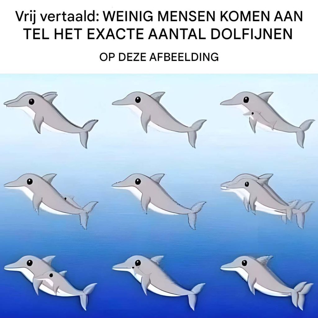 Dit zeegezicht lijkt misschien onopvallend, maar het herbergt eigenlijk verschillende walvisachtigen die zich er slim in hebben verstopt. Doe mee aan dit observatiespel en probeer de 17 dolfijnen te ontdekken die in dit kunstwerk verborgen zitten!