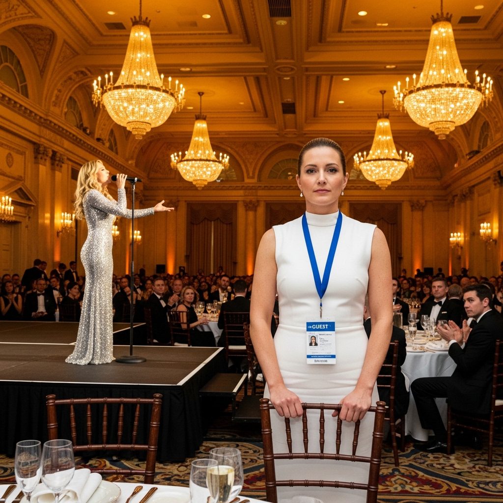 Ik zat half omgedraaid in mijn stoel, mijn vingers rustten op de steel van een champagneglas. De gastenbadge om mijn nek voelde ineens zwaarder aan. Mijn vader zei geen woord. Mijn moeder staarde naar de tafel. Mijn broer Aiden bewoog ongemakkelijk heen en weer, maar hield zijn mond dicht.