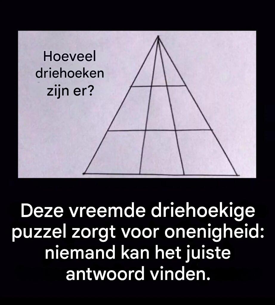 Ben je wel eens een puzzel tegengekomen die zo simpel is dat je er de hele dag over nadenkt? Deze kleine driehoek, die duizenden keren op sociale media is gedeeld, heeft precies dat effect. Op het eerste gezicht niets bijzonders. En toch, achter zijn onopvallende uiterlijk schuilt een mysterie dat in menig kantoor voor hilarische paniek heeft gezorgd. De vraag? Hoeveel driehoeken zitten er eigenlijk in verborgen? Spoiler alert: het is niet zo voor de hand liggend als het lijkt…