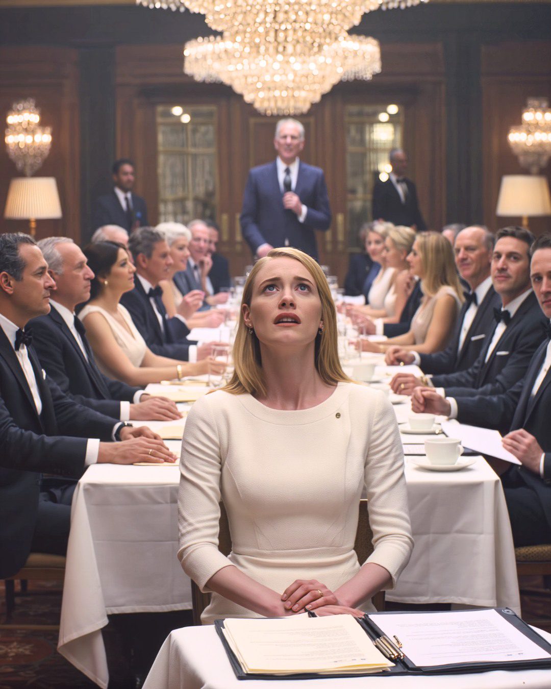 Even stond ik daar maar op de stenen trappen, mijn hand nog steeds losjes om de zware messing deurklink van het restaurant geklemd, terwijl de afgelopen uren in mijn gedachten flarden van mijn geheugen herhaalden: papa’s stem die door de microfoon galmde, mama’s fragiele glimlach, de ondertekende papieren waarvan ze dachten dat ik ze gehoorzaam zou aannemen, het gezicht van de vreemdeling in de hoek die eigenlijk helemaal geen vreemdeling was. Tante Clara.