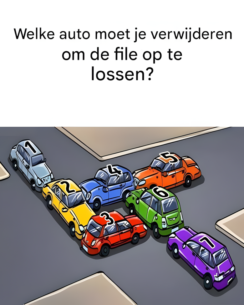 Op de foto (stel je voor dat je dit ziet) veroorzaken 7 auto’s een ware chaos. Het is aan jou om de oplossing voor het probleem te vinden: je hoeft maar één auto te verplaatsen, en alles wordt duidelijk.