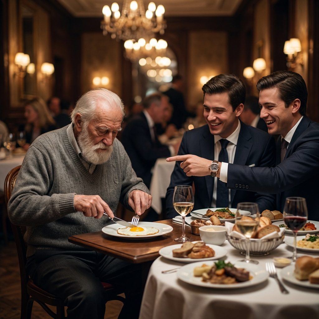 Aan een klein tafeltje, strategisch geplaatst vlak bij de keuken – de slechtste plek in het restaurant – zat een bejaarde man. Don Anselmo. Zijn tengere gestalte, zeventig jaar oud, verdween in een grijze wollen jas die betere tijden had gekend. De ellebogen waren gerafeld en stonken naar mottenballen, een schril contrast met de designerparfums van het restaurant. Zijn handen, eeltig en verweerd door de zon, rustten met een verontrustende stilte op het smetteloze tafelkleed. Maar wat de gasten het meest stoorde, waren niet zijn kleren, maar zijn diner. Voor hem, op een fijn porseleinen bord dat meer kostte dan zijn hele outfit, lag slechts een hardgekookt ei. Gepeld, gehalveerd, met een paar korreltjes zout. Niets meer. Geen wijn, geen bijgerechten, alleen een glas kraanwater.
