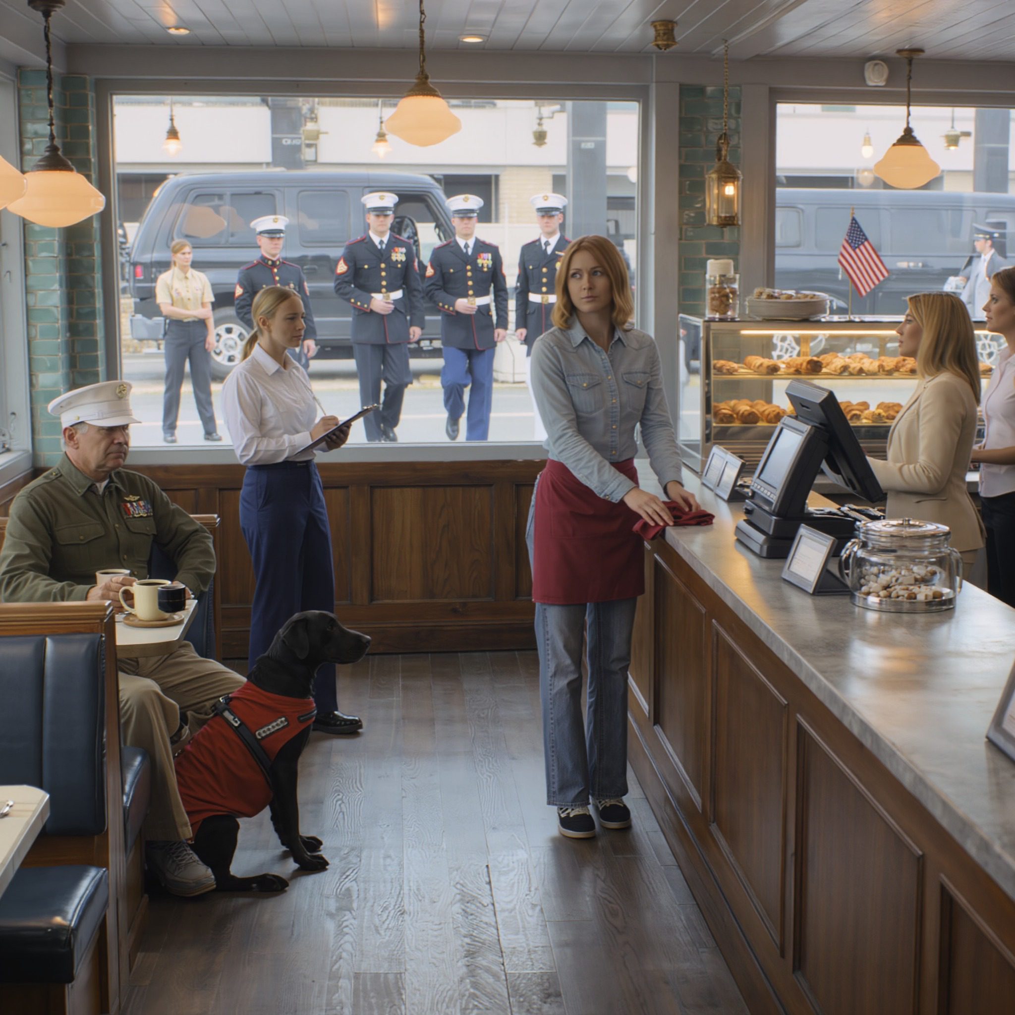 Wat Grace niet wist, was dat iemand alles had gefilmd. En nog voordat de ochtendspits in het café voorbij was, begon de grond te trillen. Vier militaire Humvees reden het terrein op. Er stapte een kolonel van de mariniers uit in zijn gala-uniform, een man die ooit zijn leven te danken had aan de veteranen die zij beschermde. En op dat moment veranderde alles.