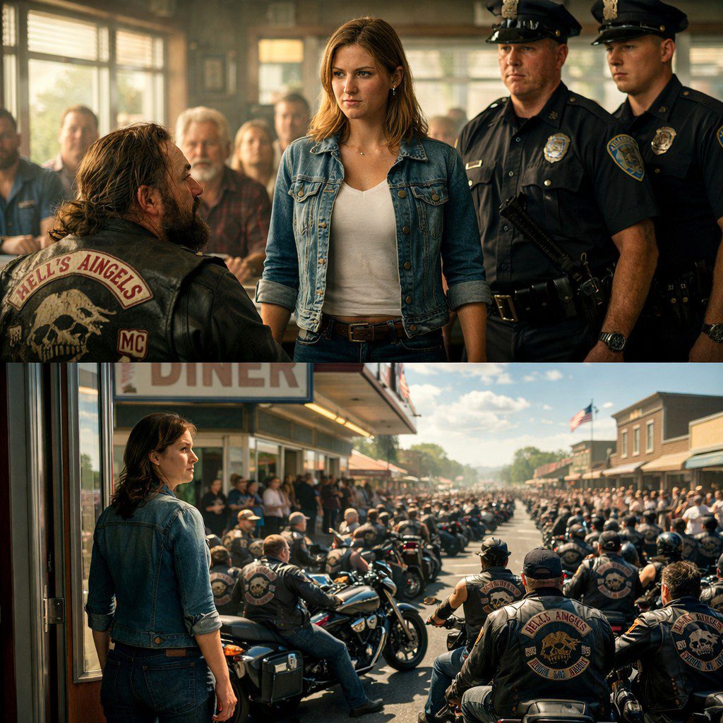 Maar haar vader had nog nooit een Hell’s Angel hoeven bedienen in hun kleine, conservatieve stadje waar geruchten over de motorclub als de waarheid rondgingen. Lisa zette haar hand stevig neer, pakte een troebel plastic menu en een glas ijswater. De andere serveerster, Jenny, had plotseling de dringende behoefte gevoeld om ketchupflesjes bij te vullen aan de andere kant van het restaurant. « Bedankt dat u naar Parker’s bent gekomen, » zei Lisa, terwijl ze hem benaderde met dezelfde geoefende glimlach die ze elke klant gaf. « De dagspecial is gehaktbrood met aardappelpuree. »