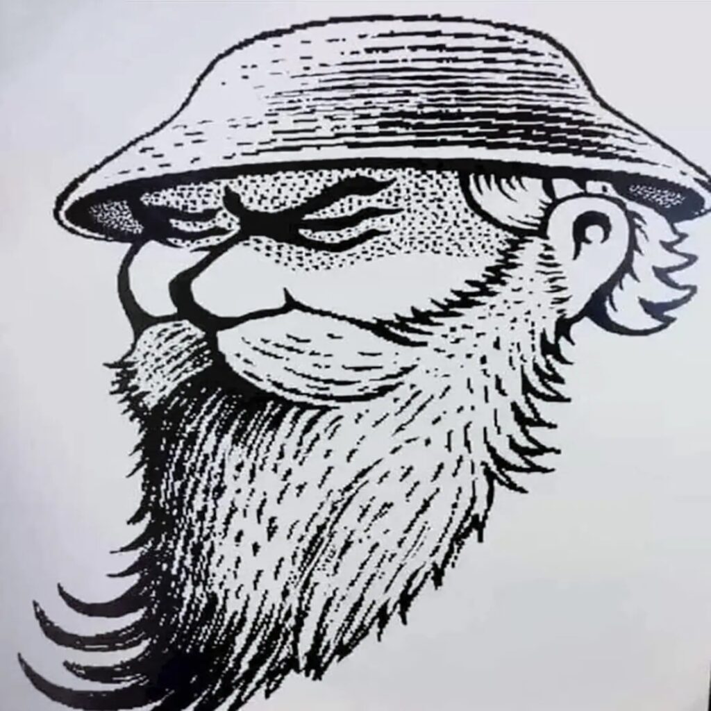 •  Een man van middelbare leeftijd, met een volle baard en een hoed die hij trots op zijn hoofd draagt.
