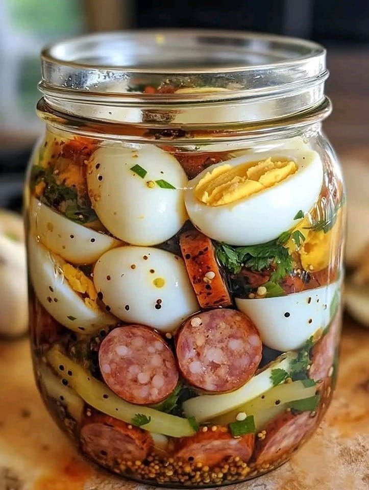 Zoete en pittige ingelegde eieren en worstjes